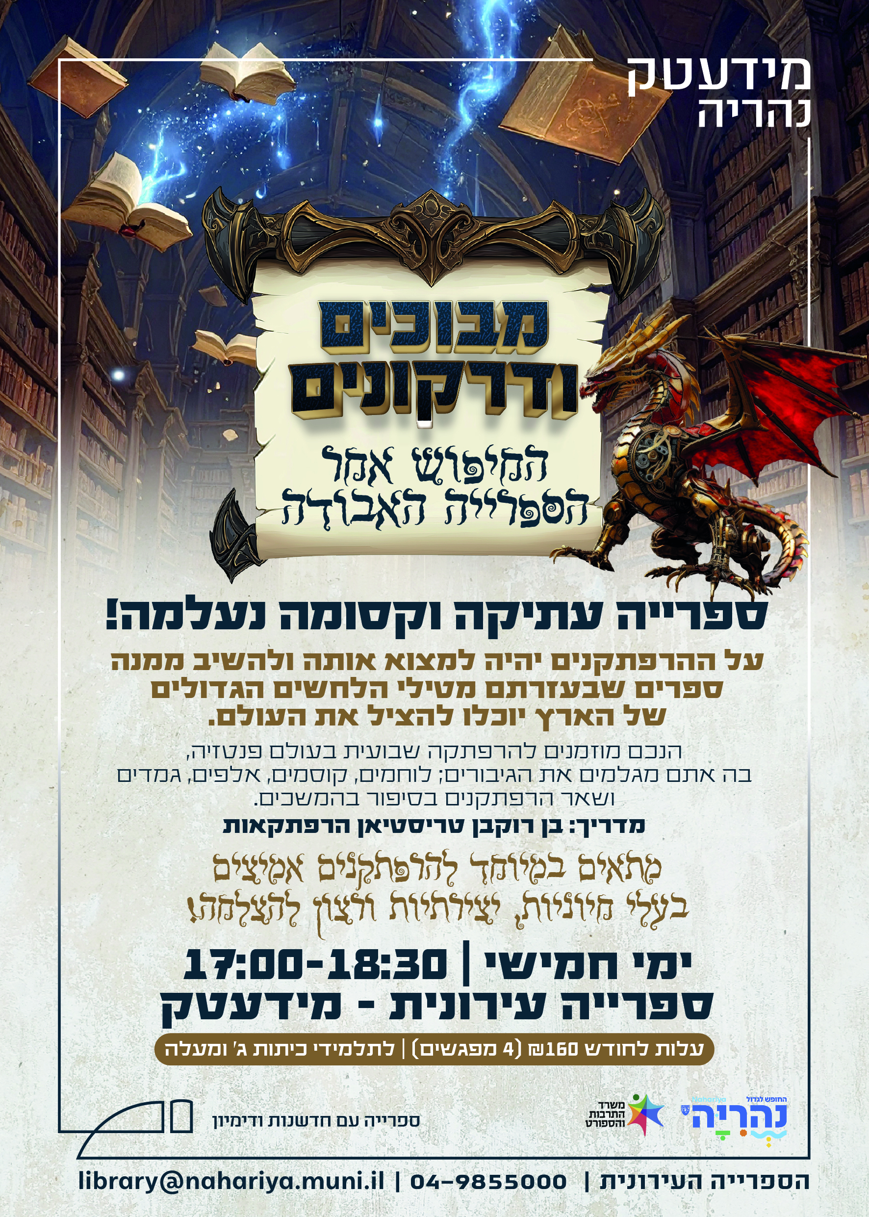 הוסף ללוח שנה 2026-05-31 17:00:00 2026-05-31 18:30:00 Asia/Jerusalem מבוכים ודרקונים בהדרכת בן רוקבן - חודש מאי 2026 למידע מלא: https://nahariya.muni.il/events/584/ ספריה עירונית - מידעטק