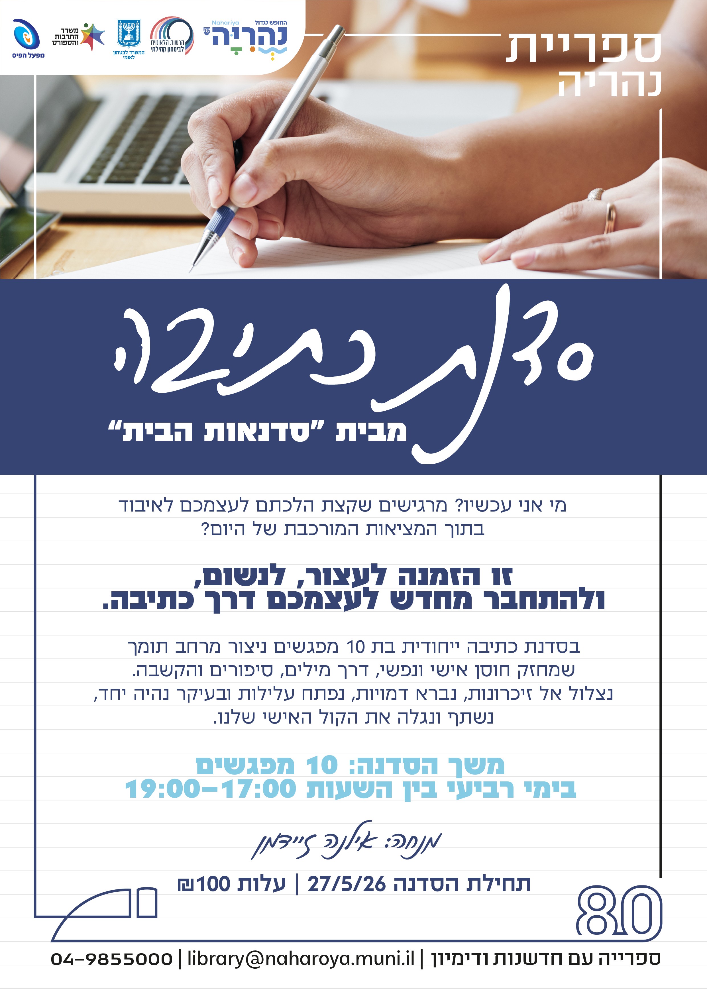 הוסף ללוח שנה 2026-06-30 17:00:00 2026-06-30 19:00:00 Asia/Jerusalem סדנת כתיבה "סדנאות הבית" בהנחיית אילנה זיידמן למידע מלא: https://nahariya.muni.il/events/659/ ספרייה עירונית
