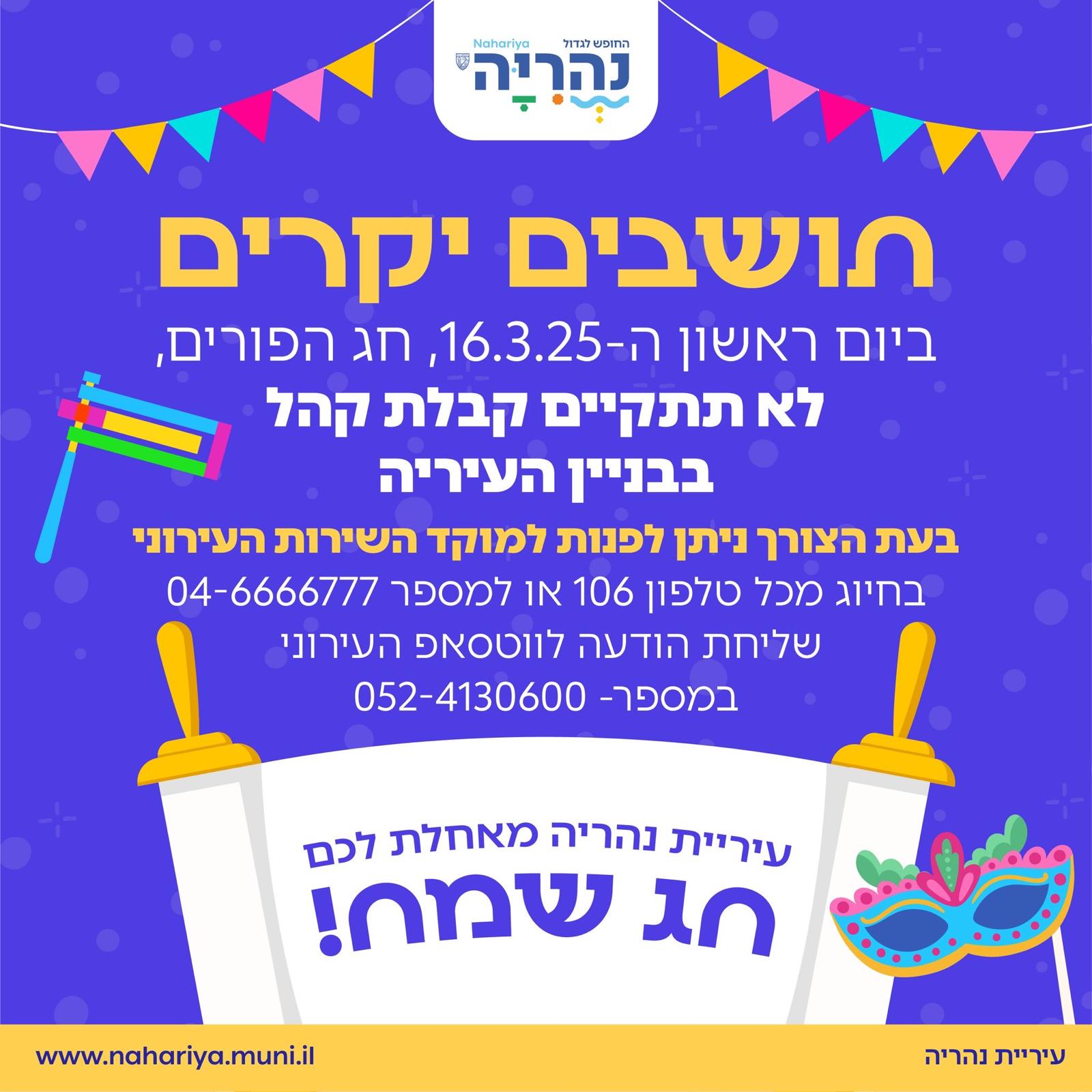 ביום ראשון הקרוב, ה-16.3.25, חג הפורים, לא תתקיים קבלת קהל בבניין העירייה.
