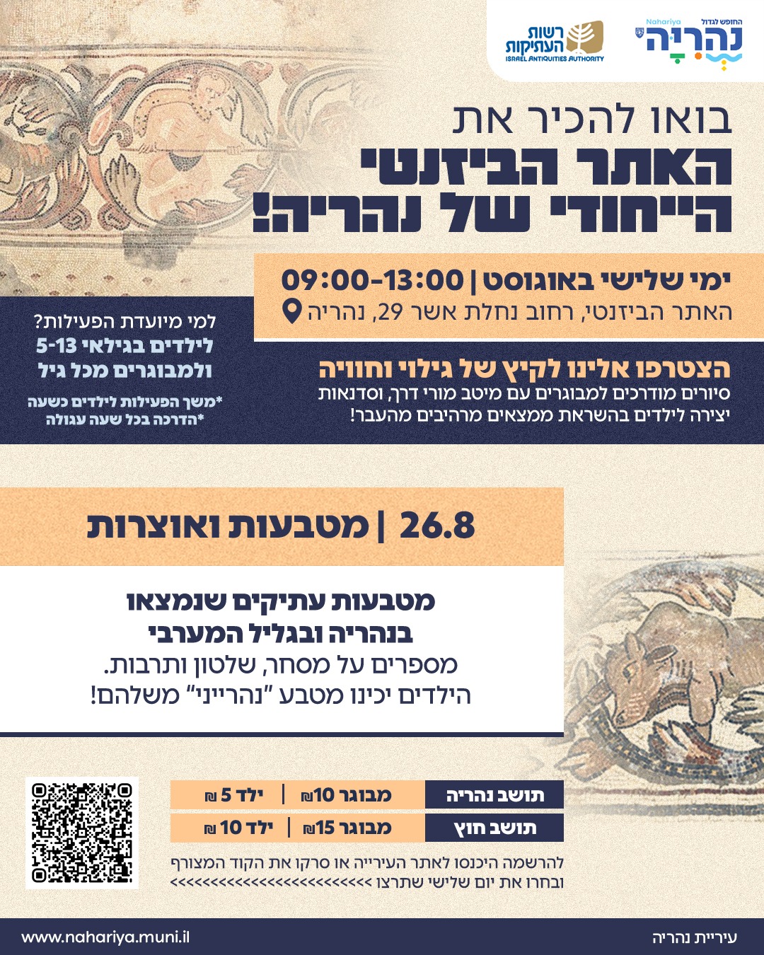 הוסף ללוח שנה 2025-08-26 09:00:00 2025-08-26 13:00:00 Asia/Jerusalem רכישת כרטיסים לקפסולה הביזנטית סיורים חודש אוגוסט 26.8 למידע מלא: https://www.nahariya.muni.il/events/553/ הקפסולה הביזנטית
